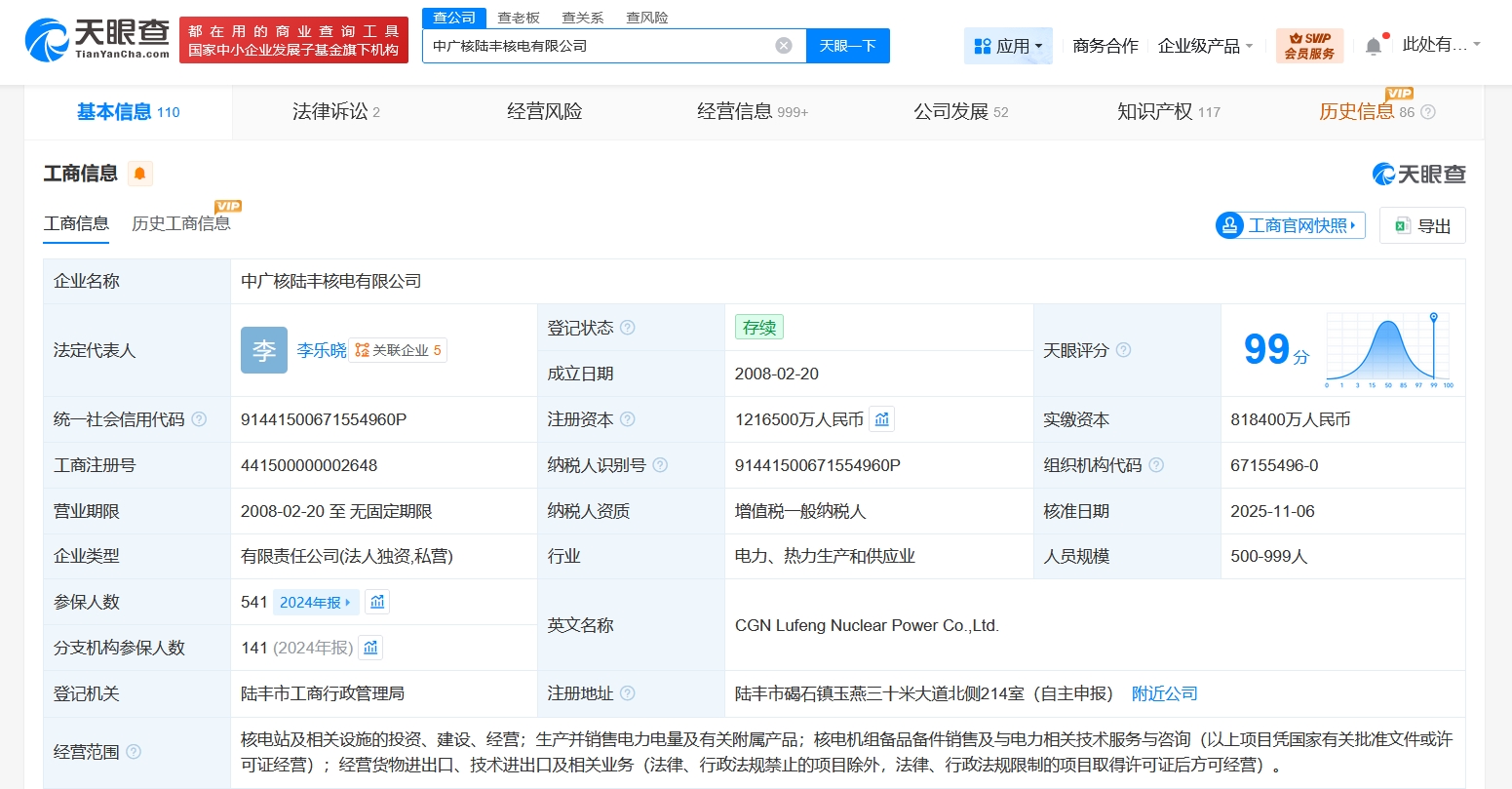 每經(jīng)AI快訊,天眼查工商信息顯示,近日,中廣核陸豐核電有限公司發(fā)生工商變更,注冊(cè)資本由111.95億元人民幣增至121.65億元人民幣,增幅約9%。該公司成立于2008年2月,法定代表人為李樂(lè)曉,經(jīng)營(yíng)范圍含核電站及相關(guān)設(shè)施的投資、建設(shè)、經(jīng)營(yíng),生產(chǎn)并銷(xiāo)售電力電量及有關(guān)附屬產(chǎn)品,核電機(jī)組備品備件銷(xiāo)售及與電力相關(guān)技術(shù)服務(wù)與咨詢等。股東信息顯示,該公司由中國(guó)廣核(003816)全資持股。