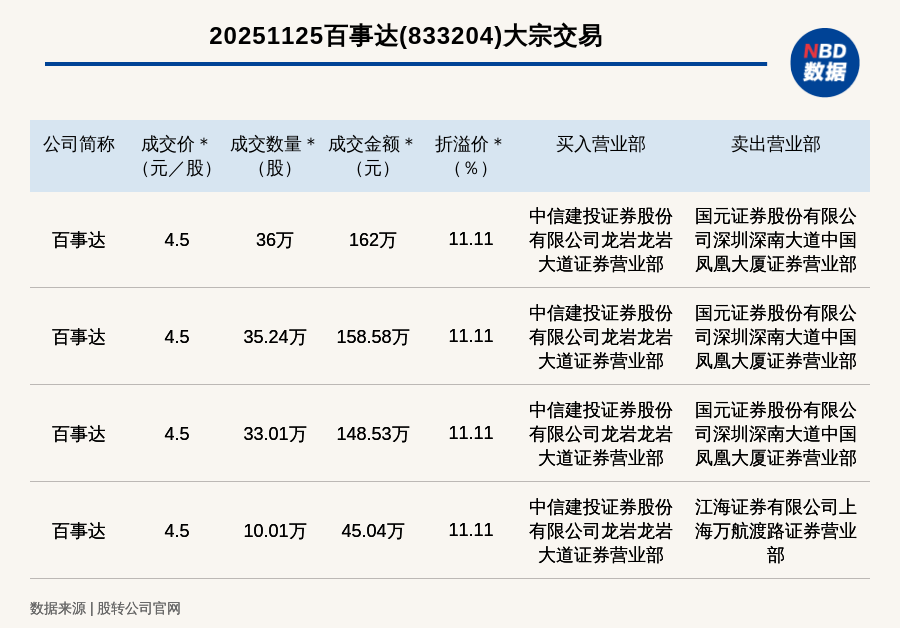 每經(jīng)訊,2025年11月25日,新三板創(chuàng)新層公司百事達(dá)(833204,收盤價(jià):4.05元)發(fā)生4筆大宗交易,總成交金額為514.16萬(wàn)元,成交金額最高的一筆成交價(jià)4.5元/股,成交數(shù)量36萬(wàn)股,成交金額162萬(wàn)元,溢價(jià)11.11%。買入營(yíng)業(yè)部是中信建投證券股份有限公司龍巖龍巖大道證券營(yíng)業(yè)部,賣出營(yíng)業(yè)部是國(guó)元證券股份有限公司深圳深南大道中國(guó)鳳凰大廈證券營(yíng)業(yè)部。