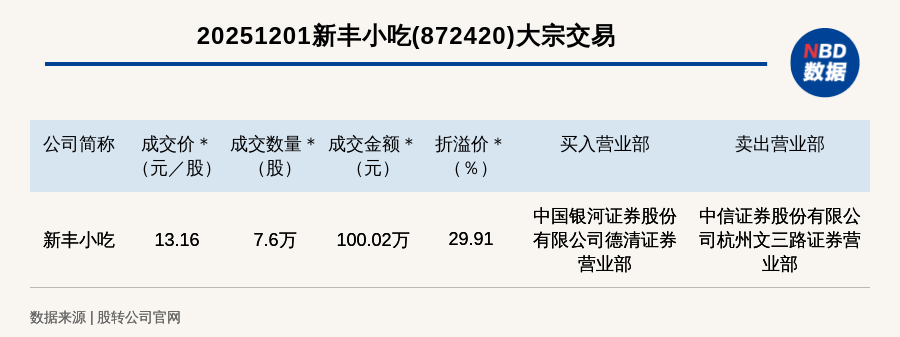每經(jīng)訊,2025年12月1日,新三板基礎(chǔ)層公司新豐小吃(872420,收盤價:10.13元)發(fā)生一筆大宗交易,成交價13.16元/股,成交數(shù)量7.6萬股,成交金額100.02萬元,溢價29.91%。買入營業(yè)部是中國銀河證券股份有限公司德清證券營業(yè)部,賣出營業(yè)部是中信證券股份有限公司杭州文三路證券營業(yè)部。