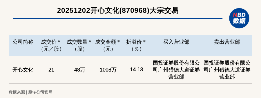 每經(jīng)訊,2025年12月2日,新三板創(chuàng)新層公司開心文化(870968,收盤價:18.4元)發(fā)生一筆大宗交易,成交價21元/股,成交數(shù)量48萬股,成交金額1008萬元,溢價14.13%。買入營業(yè)部是國投證券股份有限公司廣州獵德大道證券營業(yè)部,賣出營業(yè)部是國投證券股份有限公司廣州獵德大道證券營業(yè)部。