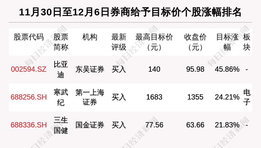 每經(jīng)AI快訊,11月30日至12月6日,券商給予評(píng)級(jí)的個(gè)股數(shù)共有64只,獲得買(mǎi)入評(píng)級(jí)的個(gè)股數(shù)共有33只。在公布了目標(biāo)價(jià)格的5只個(gè)股中,按照最新收盤(pán)價(jià)計(jì)算,預(yù)期漲幅排名居前的個(gè)股是比亞迪(002594.SZ)、寒武紀(jì)(688256.SH)、三生國(guó)?。?88336.SH),預(yù)期漲幅分別是45.86%、24.21%、21.83%。