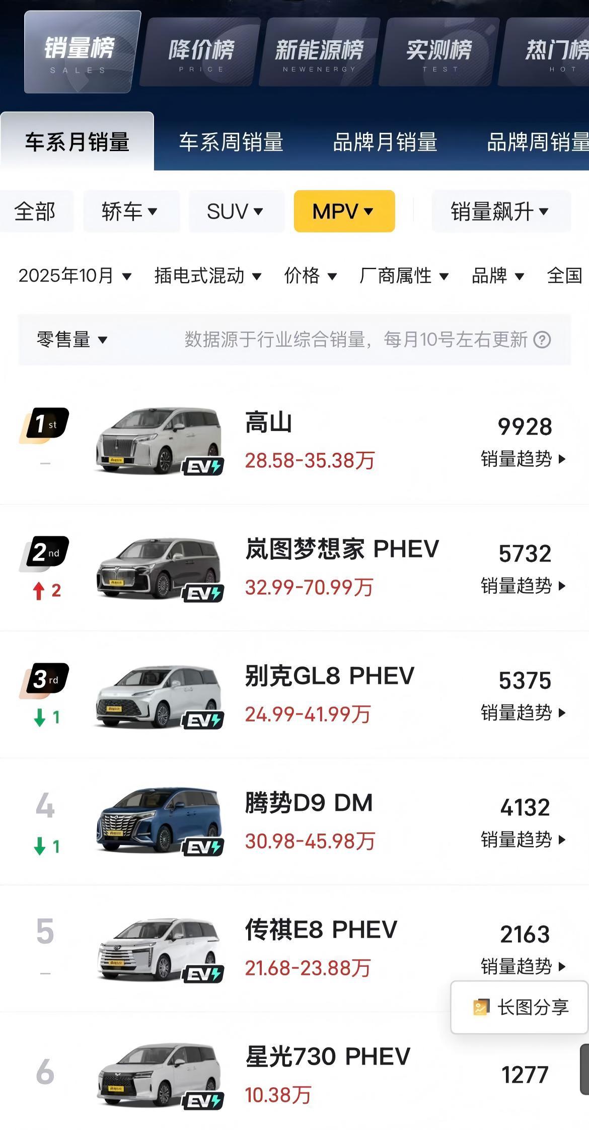 其中,自主品牌新能源MPV的表現(xiàn)頗為亮眼。從第三方10月數(shù)據(jù)來看,在插混MPV市場中,魏牌高山(28.58萬~35.38萬元)銷量9928輛,嵐圖夢想家PHEV(32.99萬~70.99萬元)銷量5732輛,別克GL8 PHEV(24.99萬~41.99萬元)銷量為5375輛,自主品牌占據(jù)了前兩名的席位。