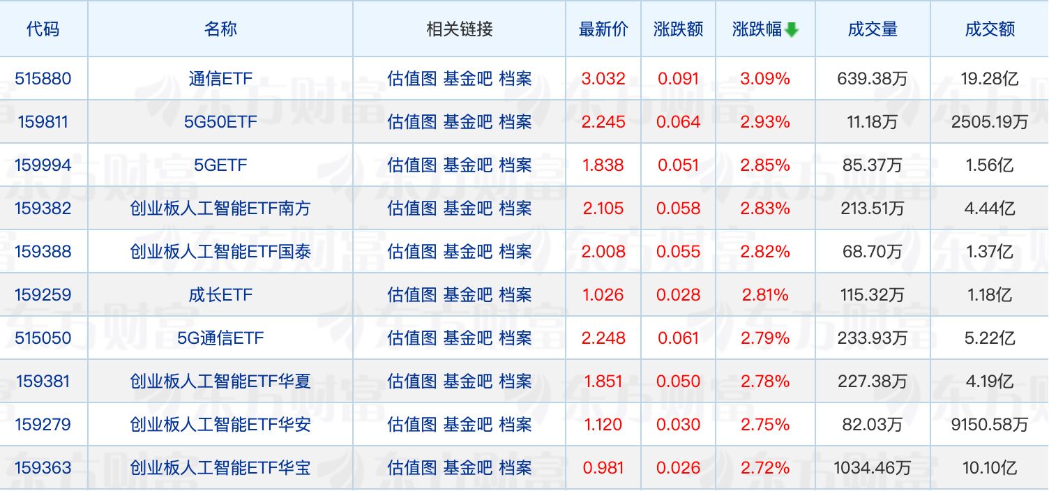 具體來看,算力硬件概念全線走強(qiáng),通信ETF漲超3%,多只5GETF、創(chuàng)業(yè)板人工智能ETF走強(qiáng)。