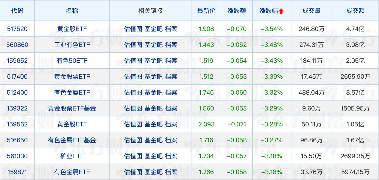 下跌方面,黃金股ETF領(lǐng)跌3.54%,有色相關(guān)ETF回調(diào)居前。