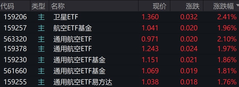 受盤面影響,衛(wèi)星、通用航空相關ETF漲約2%。