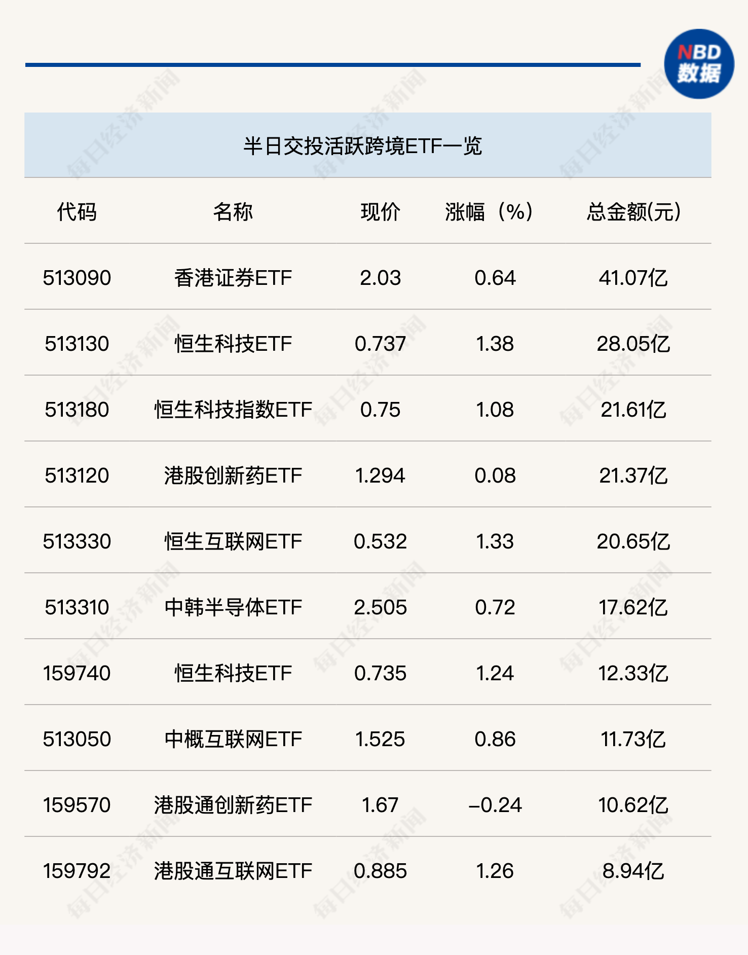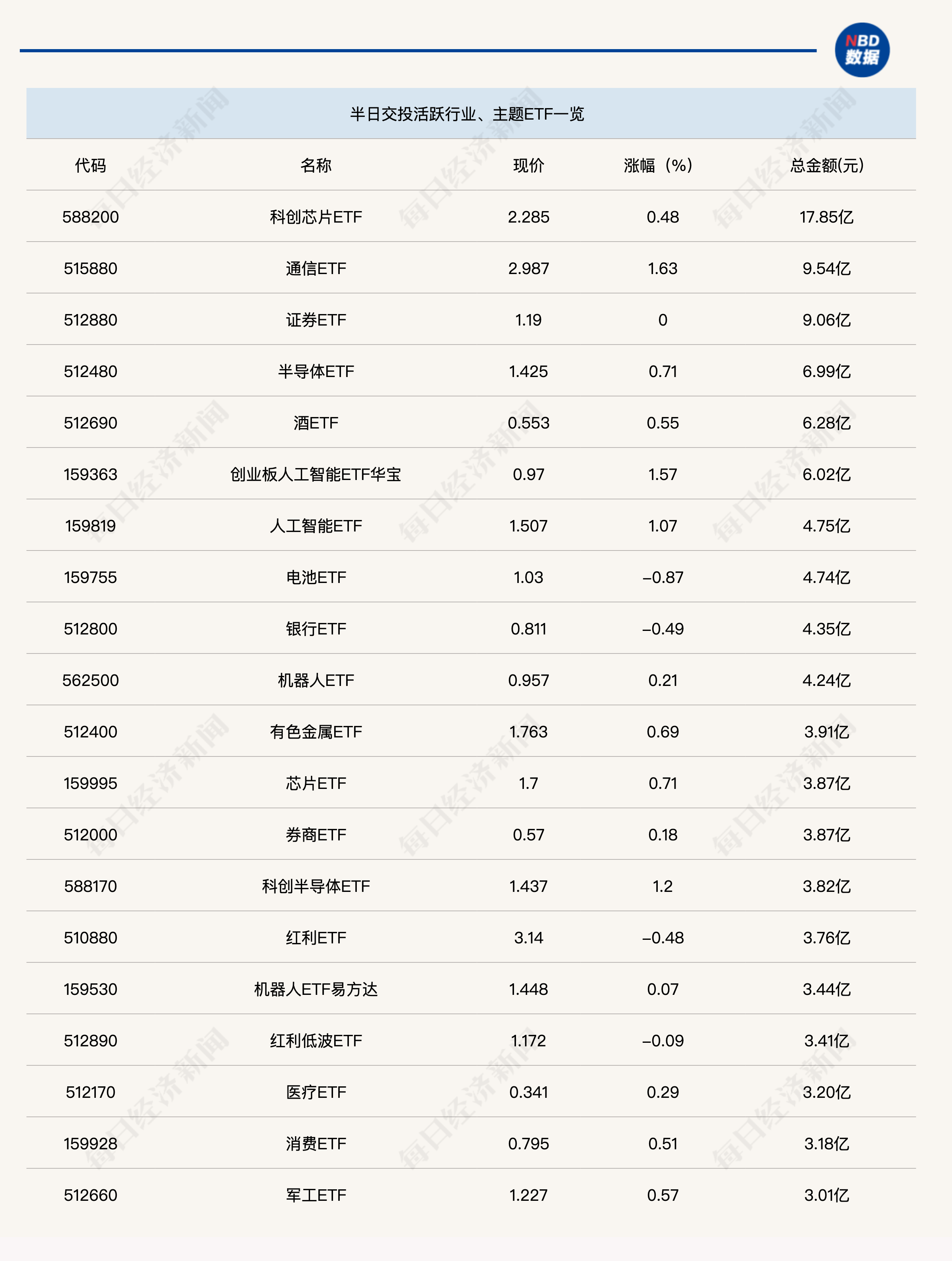 今日上午,ETF交投較為平淡。行業(yè)、主題ETF中,僅科創(chuàng)芯片ETF(588200)半日成交金額超過15億元;跨境ETF方面,香港證券ETF(513090)半日成交金額達(dá)到41億元,其余ETF半日成交金額則未超過30億元。