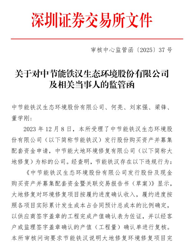 2025年12月5日,深交所同步下發(fā)兩份監(jiān)管函。首先,深交所對中節(jié)能鐵漢生態(tài)環(huán)境股份有限公司(以下簡稱 “節(jié)能鐵漢”)及4名高管采取書面警示措施,經(jīng)查,節(jié)能鐵漢收購的大地修復(fù)部分項目存在提前確認(rèn)收入情形。這已不是節(jié)能鐵漢首次在財務(wù)規(guī)范上暴露出問題。去年9月,深圳證監(jiān)局曾就財務(wù)會計核算不規(guī)范等問題對節(jié)能鐵漢開出罰單。