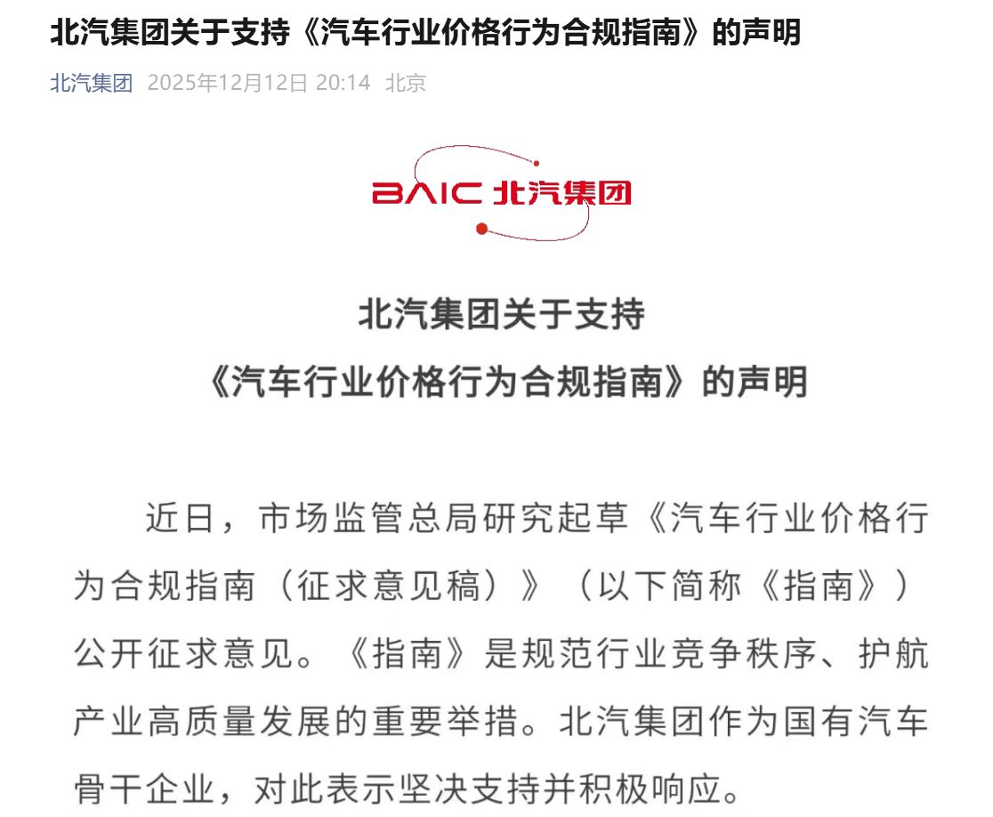 北汽集團(tuán)也發(fā)聲明稱,近日,市場(chǎng)監(jiān)管總局研究起草《汽車行業(yè)價(jià)格行為合規(guī)指南 (征求意見(jiàn)稿)》(以下簡(jiǎn)稱《指南》) 公開(kāi)征求意見(jiàn)?!吨改稀肥且?guī)范行業(yè)競(jìng)爭(zhēng)秩序、護(hù)航產(chǎn)業(yè)高質(zhì)量發(fā)展的重要舉措。北汽集團(tuán)作為國(guó)有汽車骨干企業(yè),對(duì)此表示堅(jiān)決支持并積極響應(yīng)。