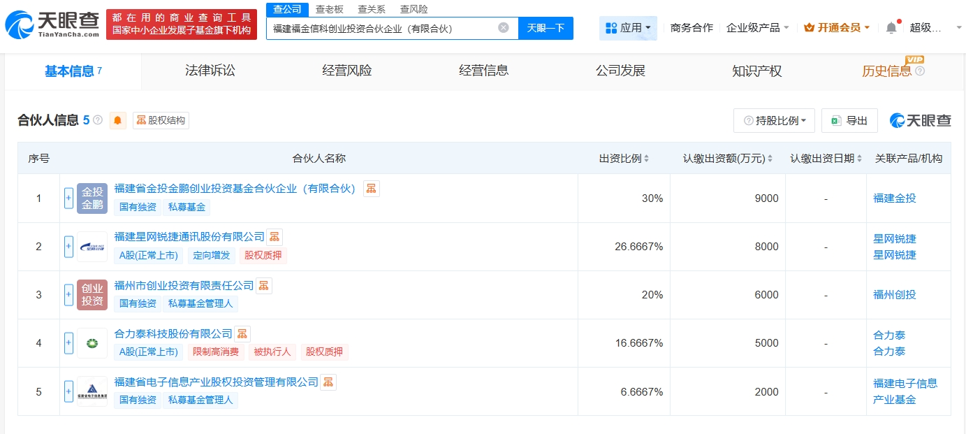 每經(jīng)AI快訊,天眼查工商信息顯示,近日,福建福金信科創(chuàng)業(yè)投資合伙企業(yè)(有限合伙)成立,執(zhí)行事務(wù)合伙人為福建省電子信息產(chǎn)業(yè)股權(quán)投資管理有限公司,出資額3億元人民幣,經(jīng)營范圍包括創(chuàng)業(yè)投資,以私募基金從事股權(quán)投資、投資管理、資產(chǎn)管理等活動。合伙人信息顯示,該合伙企業(yè)由福建省金投金鵬創(chuàng)業(yè)投資基金合伙企業(yè)(有限合伙)、星網(wǎng)銳捷(002396)、合力泰(002217)等共同出資。