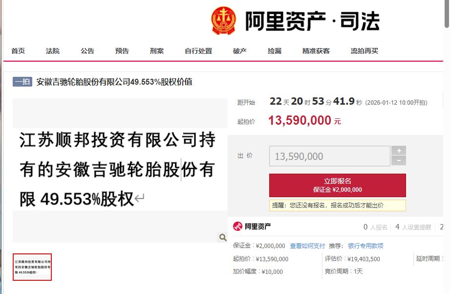 《每日經(jīng)濟新聞》記者查詢到,江蘇順邦所持吉馳輪胎49.55%股權(quán)已經(jīng)被法院查封,評估值1940.35萬元。該股權(quán)將于2026年1月12日10時至2026年1月13日10時進行司法拍賣。