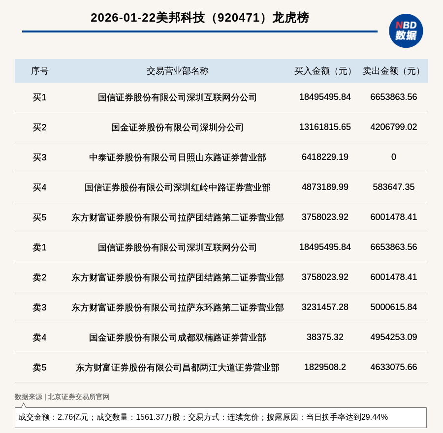 每經(jīng)訊,2026年1月22日,北交所上市公司美邦科技(920471,收盤(pán)價(jià):17.03元)登上龍虎榜,交易方式是連續(xù)競(jìng)價(jià),披露原因是當(dāng)日換手率達(dá)到29.44%,成交數(shù)量1561.37萬(wàn)股,成交金額2.76億元。買(mǎi)一席位為國(guó)信證券股份有限公司深圳互聯(lián)網(wǎng)分公司,買(mǎi)入1849.55萬(wàn)元;賣(mài)一席位為國(guó)信證券股份有限公司深圳互聯(lián)網(wǎng)分公司,賣(mài)出665.39萬(wàn)元。